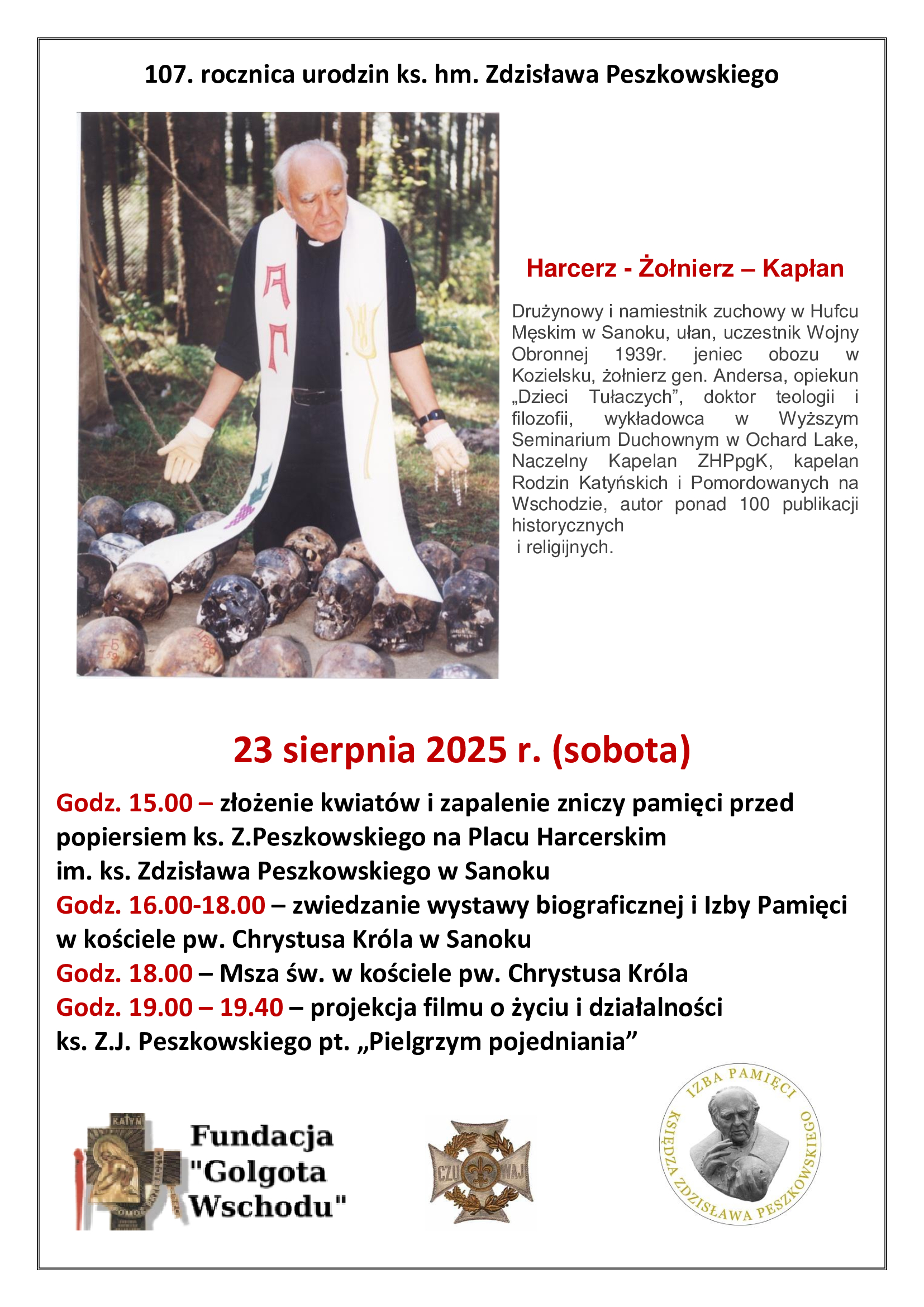 W sobotę, 23 sierpnia 2025 r., w Sanoku odbędą się uroczystości związane ze 107. rocznicą urodzin ks. hm. Zdzisława Peszkowskiego – kapłana, żołnierza, harcerza, opiekuna „Dzieci Tułaczych” i wieloletniego kapelana Rodzin Katyńskich i Pomordowanych na Wschodzie.