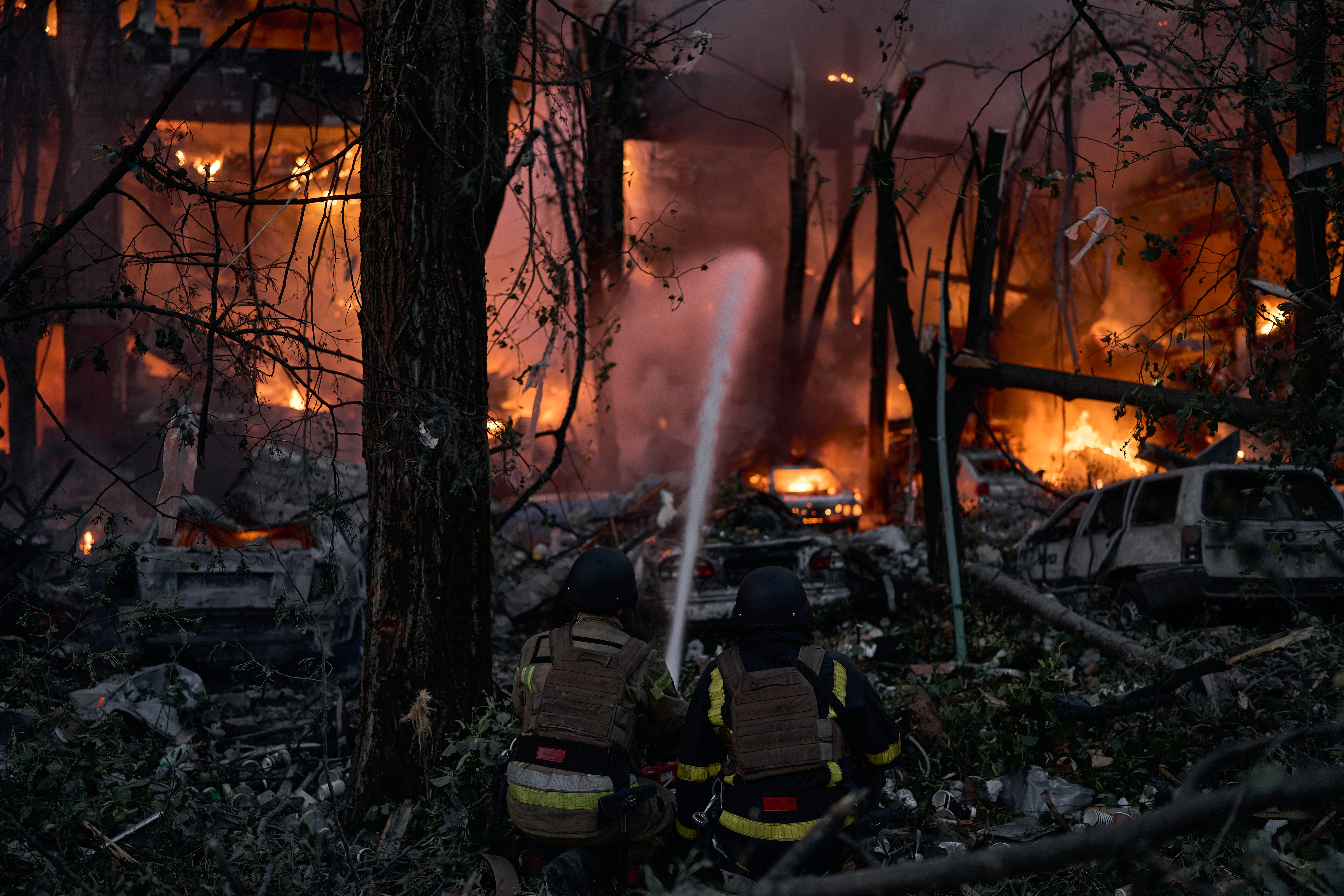Los incendios afectaron varios edificios no residenciales en los distritos mencionados. En Dniprovskyi, las explosiones destruyeron ventanas, dañaron vehículos y dejaron un cráter en el patio de un edificio residencial, mientras que un jardín de infancia también sufrió daños estructurales.