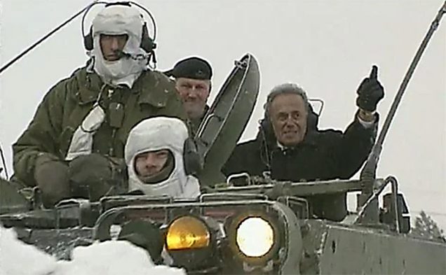 Mel Lastman wraz z żołnierzami na wojskowym pojeździe.