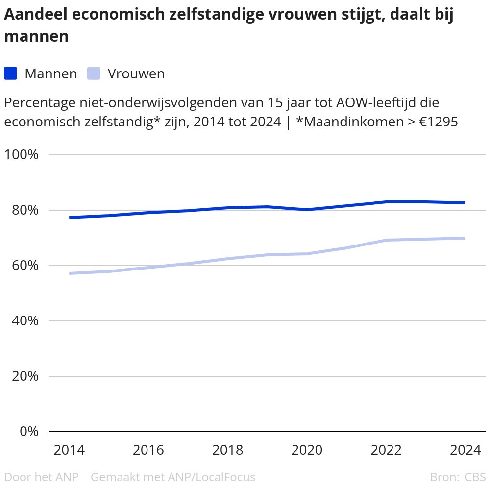 In Groningen is dit verschil het kleinst, met 77 procent bij mannen tegenover 72 procent bij vrouwen. Het CBS rapporteerde eerder deze maand dat het aantal vrouwen zonder eigen inkomen daalde van 10 procent tien jaar geleden naar 6 procent vorig jaar.