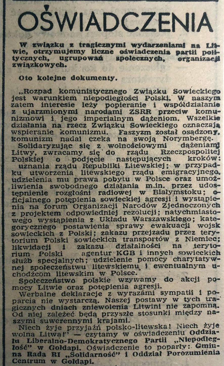 Gdy w latach 1990–1991 odradzała się wolna Litwa, wybijając się na niepodległość, w Gołdapi solidaryzowano się z nią. Dokładnie przed 35 laty, 21 stycznia 1991 roku w prasie regionalnej – białostockiej „Gazecie Współczesnej” opublikowano „Oświadczenie” gołdapskich organizacji społecznych i politycznych wzywające polski rząd do uznania rządu Republiki Litewskiej. Byłem inicjatorem i autorem tego stanowiska jako przewodniczący gołdapskiego oddziału L-DPN (Liberalno-Demokratyczna Partia „Niepodległość”), który kilka miesięcy później, po ustaleniach z Donaldem Tuskiem, wszedł w skład Kongresu Liberalno-Demokratycznego.