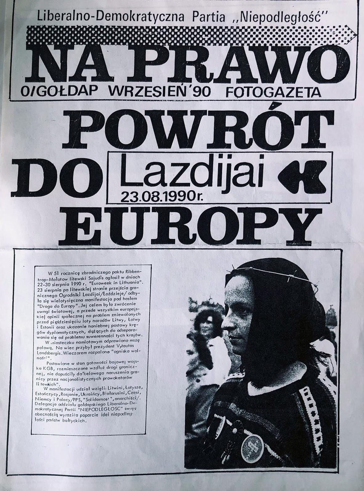 23 sierpnia 1990 r. w 51. rocznicę paktu Ribbentrop – Mołotow uczestniczyliśmy po stronie litewskiej przejścia Ogrodniki – Lazdijai w wielotysięcznej pokojowej manifestacji „Droga do Europy” z udziałem też prezydenta Litwy Vytautasa Landsbergisa. Gołdapian, z banerem L-DPN, organizatorzy zaprosili na scenę. Impreza przebiegała w napiętej atmosferze. Wokół obecne były oddziały sowieckich wojsk specjalnych. Fotorelacja z tej manifestacji wolnościowej Litwinów, Łotyszy i Estończyków w załączeniu.