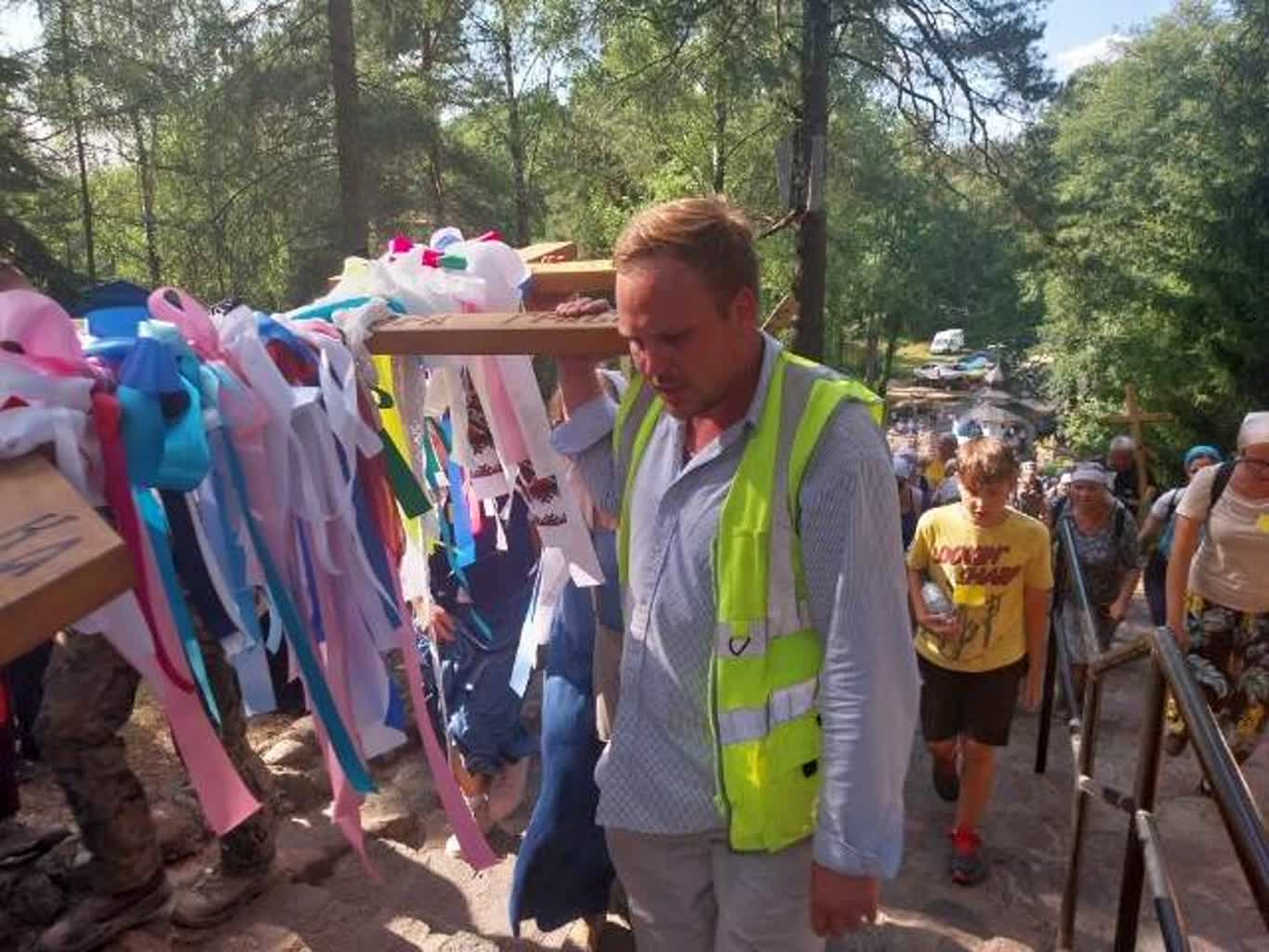 – Zasadniczym celem każdej pielgrzymki na górę Grabarkę jest wniesienie i poświęcenie wotywnego krzyża – mówi generał brygady Jarosław Mokrzycki, dowódca Wielonarodowej Brygady Litewsko-Polsko-Ukraińskiej w Lublinie. – Tym razem to była inicjatywa naszych żołnierzy. Krzyż, który my wniesiemy przedstawicielami naszej międzynarodowej społeczności, będzie trochę inny. To prosty, żołnierski krzyż, pokaleczony odłamkami bomb, pocisków, zebranych na polach bitewnych wschodniej Ukrainy. Padł taki pomysł, żeby w jakiś sposób uszanować tych, którzy polegli na polach na wschodzie. To przygotowany przez nas krzyż, ze starego, zniszczonego drewna, z belek, które mają ponad 200 lat i fragmentów żelastwa, które przyniosło śmierć wielu ludziom na wschodzie Ukrainy – nie tylko żołnierzom, ale również osobom cywilnym. Nasze uszanowanie, nasz hołd dla tych poległych bohaterów.