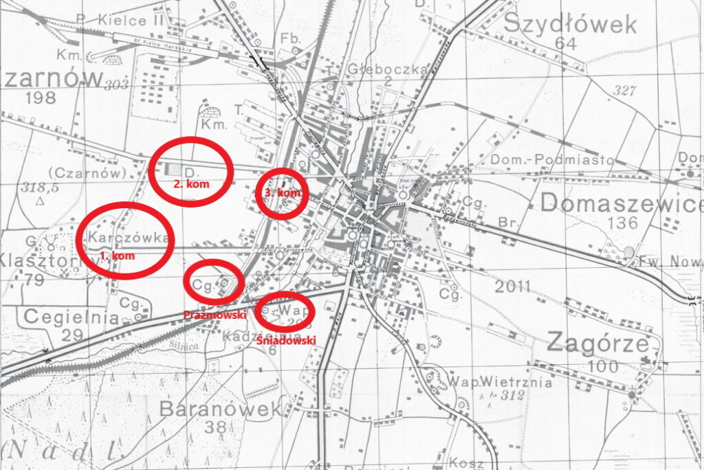 W Kielcach pojawili się nad ranem 13 sierpnia. Prawie natychmiast zostali skierowani na pozycje bojowe. Zajęli stanowiska w rejonie kamieniołomów Kadzielnia. Niedaleko od nich, w cegielni Rozenholtza – w pobliżu skrzyżowania toru kolejowego z szosą krakowską, stacjonował oddział konny Władysława Prażmowskiego pseudonim „Belina”.