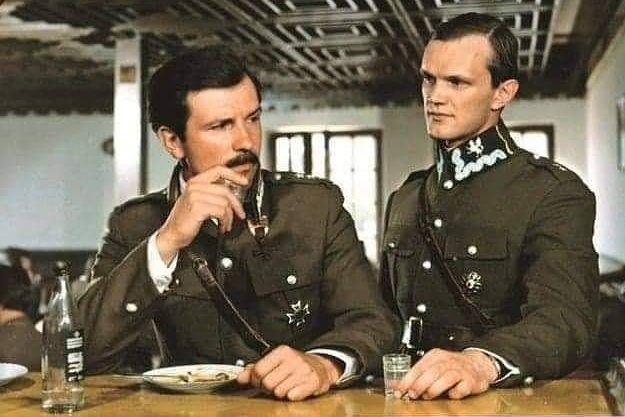 Kadr z filmu „Pogranicze w ogniu”. Na zdjęciu (od prawej): Czarek Adamski (Cezary Pazura) i Jerzy Osnowski (Tomasz Stockinger). / Źródło: PRL – FacebookZamienił konia na lokomotywę