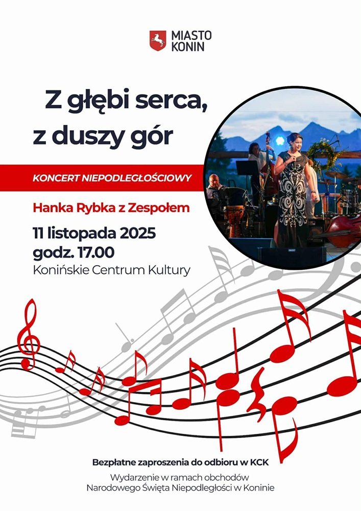 Obchody Narodowego Święta Niepodległości zakończy koncert „Z głębi serca, z duszy gór”, w którym wystąpi Hanka Rybka wraz z zespołem znakomitych muzyków z Podhala. Poprowadzi go Andrzej Majewski – prezes Konińskiego Towarzystwa Muzycznego. Usłyszymy tradycyjne utwory śpiewane przez pokolenia naszych przodków – w domach, na frontach. W repertuarze znajdą się m.in. znane i poruszające pieśni: „Legiony”, „Przybyli ułani pod okienko”, „Rozkwitały pąki białych róż”, „Wojenko, wojenko”, a także piękna, tradycyjna muzyka góralska, która dopełni całości niezwykłym, regionalnym brzmieniem. W tym koncercie będzie też nawiązanie do naszej konińskiej pisarki Zofii Urbanowskiej, która w listopadzie 1885 roku przekazała wybitnemu etnografowi polskiemu Oskarowi Kolbergowi 74 przyśpiewek z Podhala. Chcemy w ten sposób podkreślić rolę Zofii Urbanowskiej w zachowywaniu i upowszechnianiu dziedzictwa narodowego związanego z Podhalem i Tatrami w okresie Polski pod zaborami.