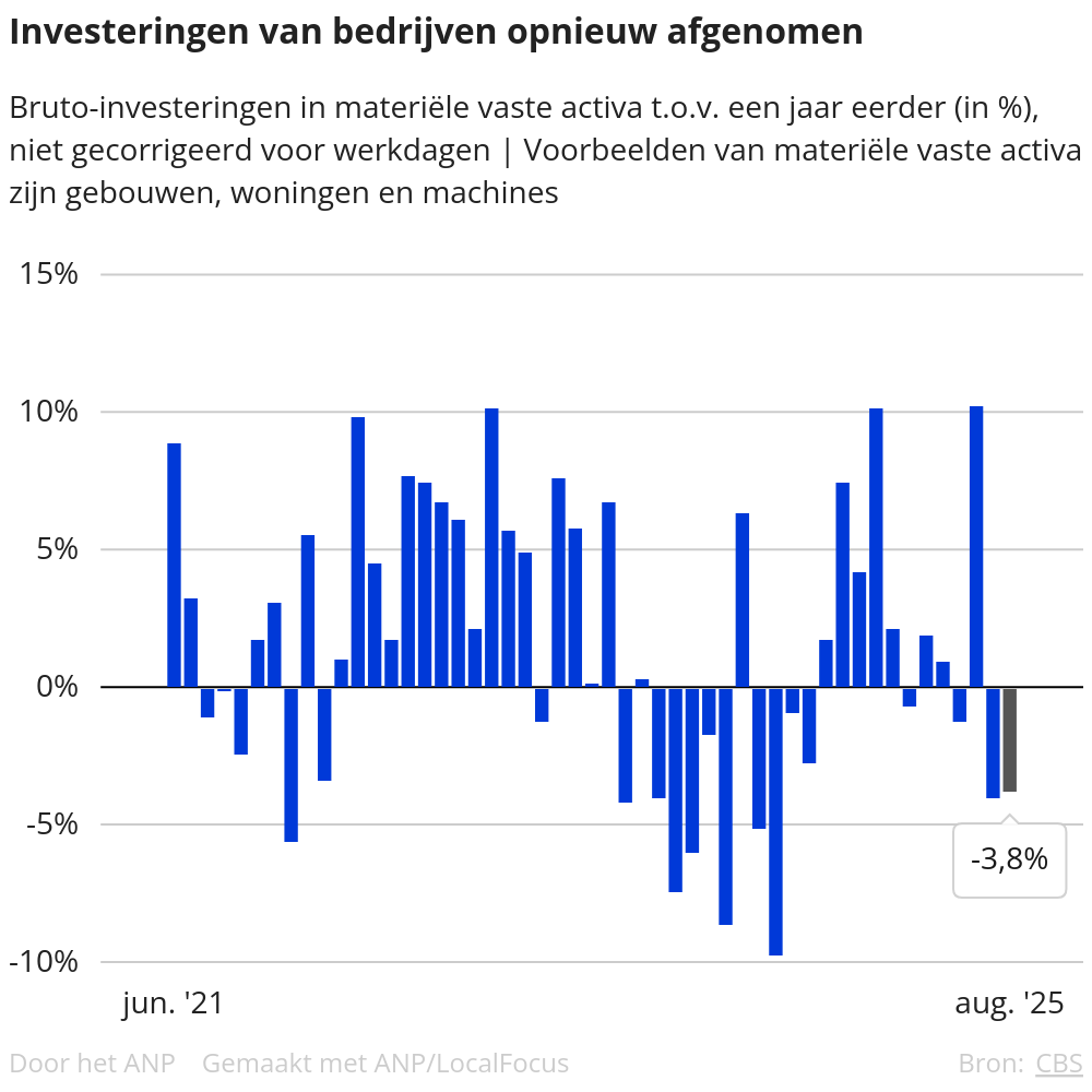 Nederlandse bedrijven investeerden in augustus 3,8 procent minder dan een jaar eerder. Het Centraal Bureau voor de Statistiek (CBS) meldt dat dit de tweede achtereenvolgende maand is met dalende investeringen.
