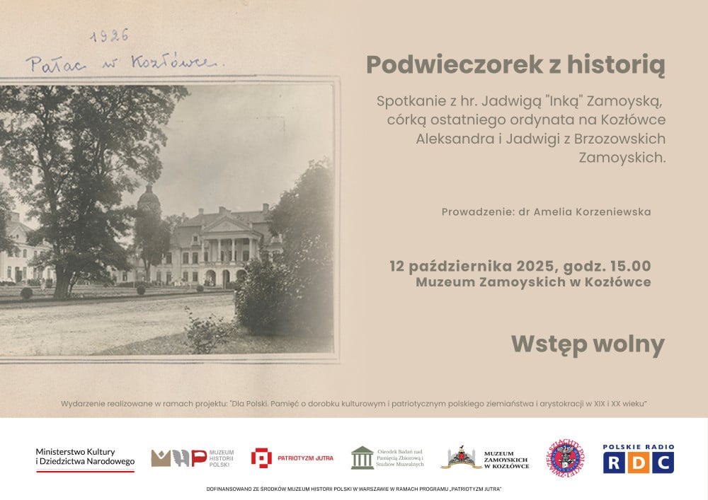 Spotkanie pod hasłem „Podwieczorek z historią” odbędzie się w niedzielę 12 października o godz. 15 w Muzeum Zamoyskich w Kozłówce. Jest to jedno z ostatnich spotkań w kraju p. Jadwigi Zamoyskiej, bowiem niedługo wyjeżdża i do Polski wróci dopiero na wiosnę. Zapraszamy!