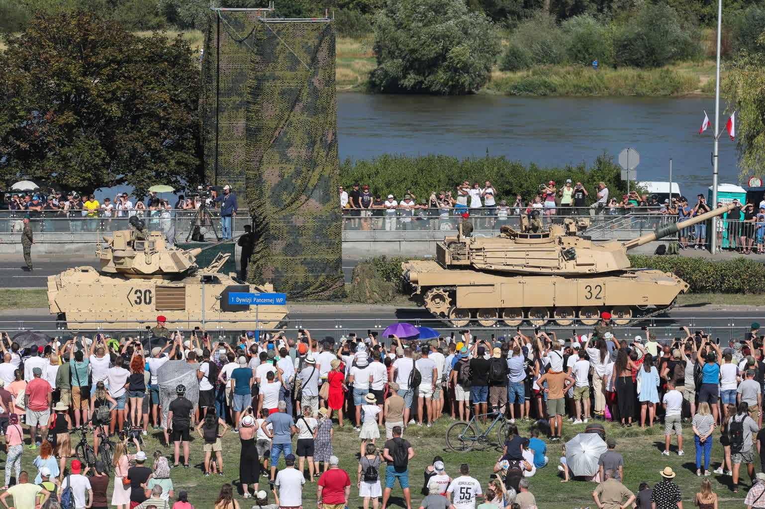 Także niedawno dostarczone polskie Abramsy wzięły udział w defiladzie; widzowie mogli zobaczyć kilkadziesiąt sztuk. Trzeci, obok Leopardów i Abramsów, typ czołgów stanowiły zakupione w Korei K2 – na defiladzie można było zobaczyć ok 20 sztuk.
