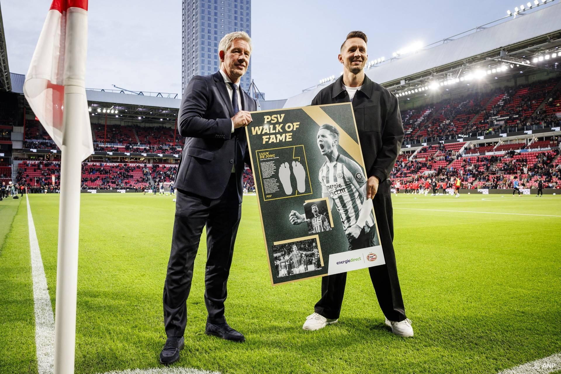 PSV heeft zaterdag afscheid genomen van Luuk de Jong (35) met bijzondere onderscheidingen voor aanvang van de thuiswedstrijd tegen Go Ahead Eagles. Algemeen directeur Marcel Brands reikte de voormalig aanvoerder op de middenstip een bronzen aanvoerdersband uit. De Jong speelt inmiddels voor FC Porto.