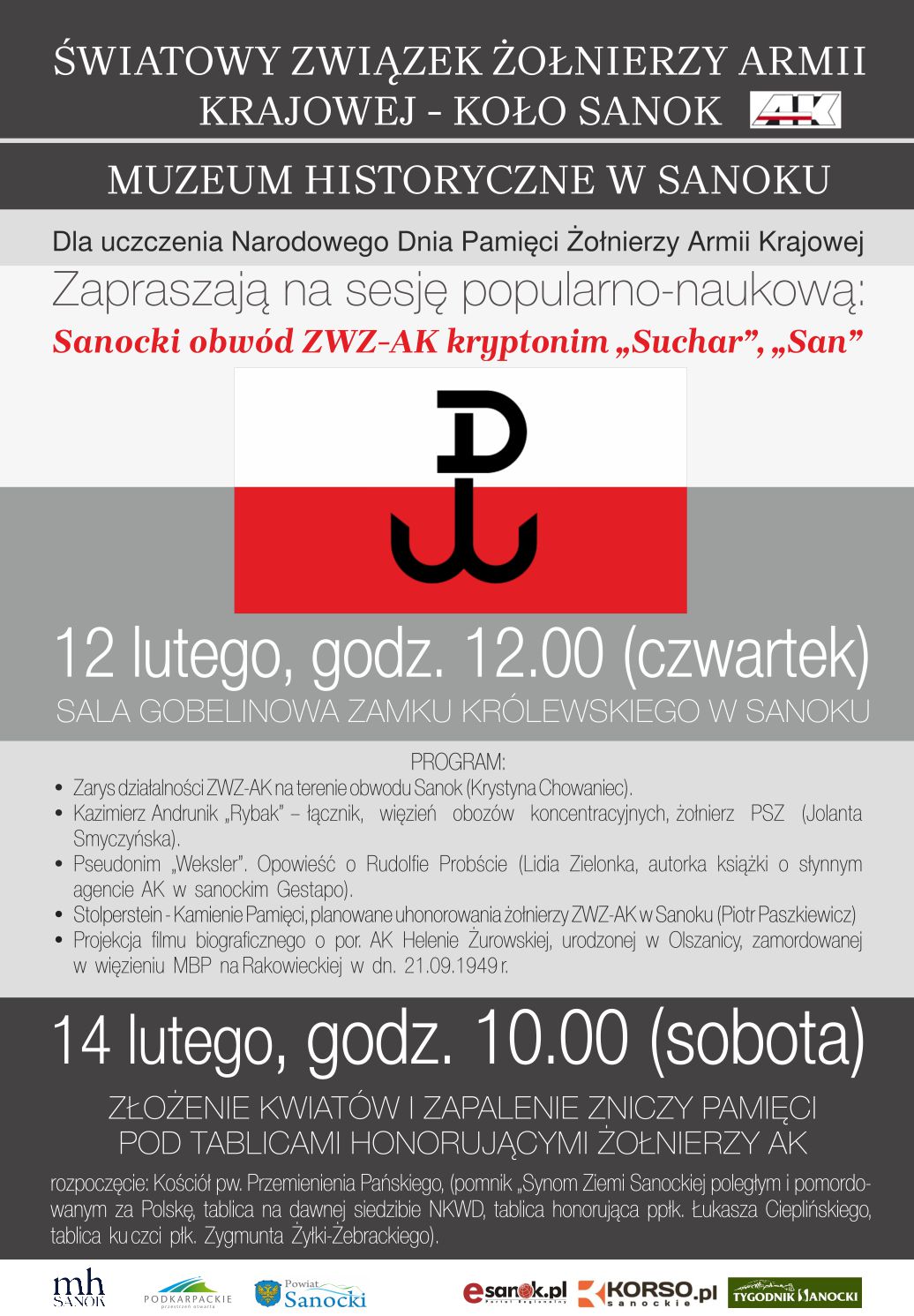 Centralnym punktem obchodów będzie spotkanie poświęcone działalności sanockiego obwodu ZWZ-AK, działającego pod kryptonimami „Suchar” i „San”. Wydarzenie odbędzie się 12 lutego o godz. 12.00 w Sali Gobelinowej Zamku Królewskiego w Sanoku. W programie zaplanowano wykłady historyczne oraz projekcję filmu.