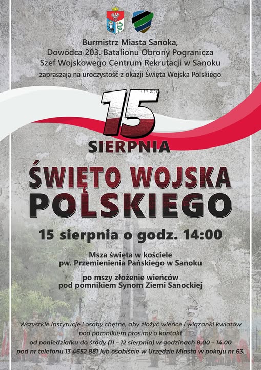 Burmistrz Miasta Sanoka, Dowódca 203. Batalionu Obrony Pogranicza oraz Szef Wojskowego Centrum Rekrutacji w Sanoku zapraszają mieszkańców do udziału w uroczystościach z okazji Święta Wojska Polskiego.