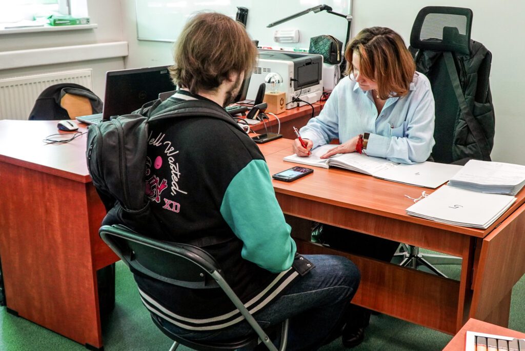 Rozmowa psychologiczna w ramach kwalifikacji wojskowej w Siemianowicach Śląskich. Od lewej: mieszkaniec miasta podlegający wezwaniu oraz psycholog