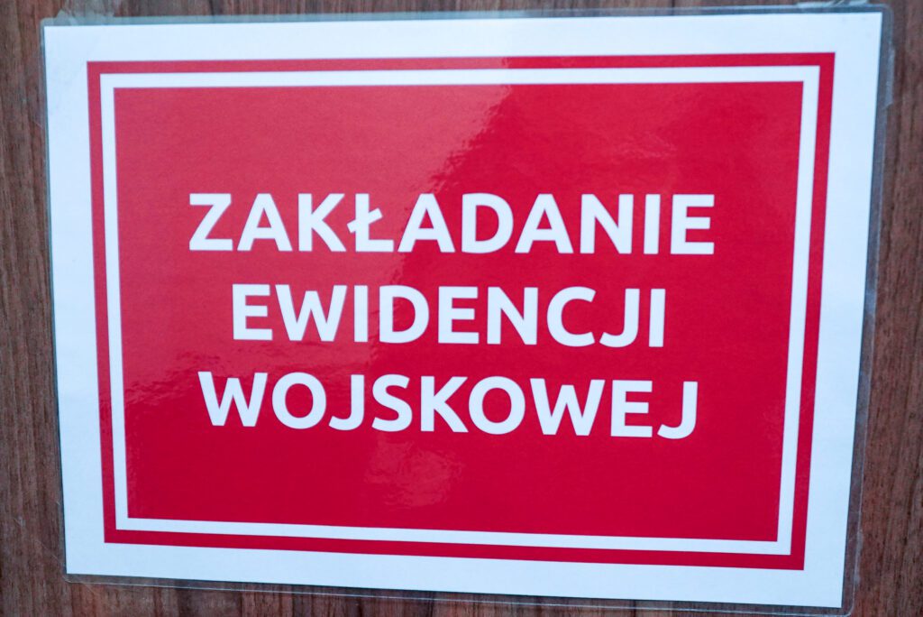Tabliczka informująca o pomieszczeniu do zakładania ewidencji wojskowej w Wydziale Zarządzania Kryzysowego Urzędu Miasta