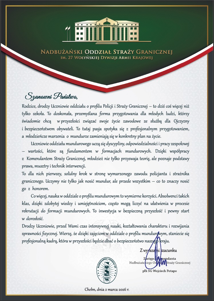 Podczas uroczystości ślubowania kadetów miało również miejsce inne podniosłe wydarzenie – wręczenie Stypendiów Prezesa Rady Ministrów najlepszym uczennicom szkoły. Uroczystego przekazania aktów stypendialnych dokonał starszy wizytator Lubelskiego Kuratorium Oświaty – Jerzy Surma wraz z Dyrektor Szkoły – Teresą Biernat. Stypendium Prezesa Rady Ministrów w roku szkolnym 2025/2026 otrzymały: uczennica klasy 3 LO – Oliwia Lewczyk i uczennica klasy IV Technikum Żywienia i Usług Gastronomicznych -Kinga Kozyra. To wyróżnienie jest wyrazem uznania dla ich ciężkiej pracy, systematyczności i wysokich wyników w nauce. Serdecznie gratulujemy sukcesu i życzymy dalszego rozwoju oraz spełniania ambitnych planów edukacyjnych.