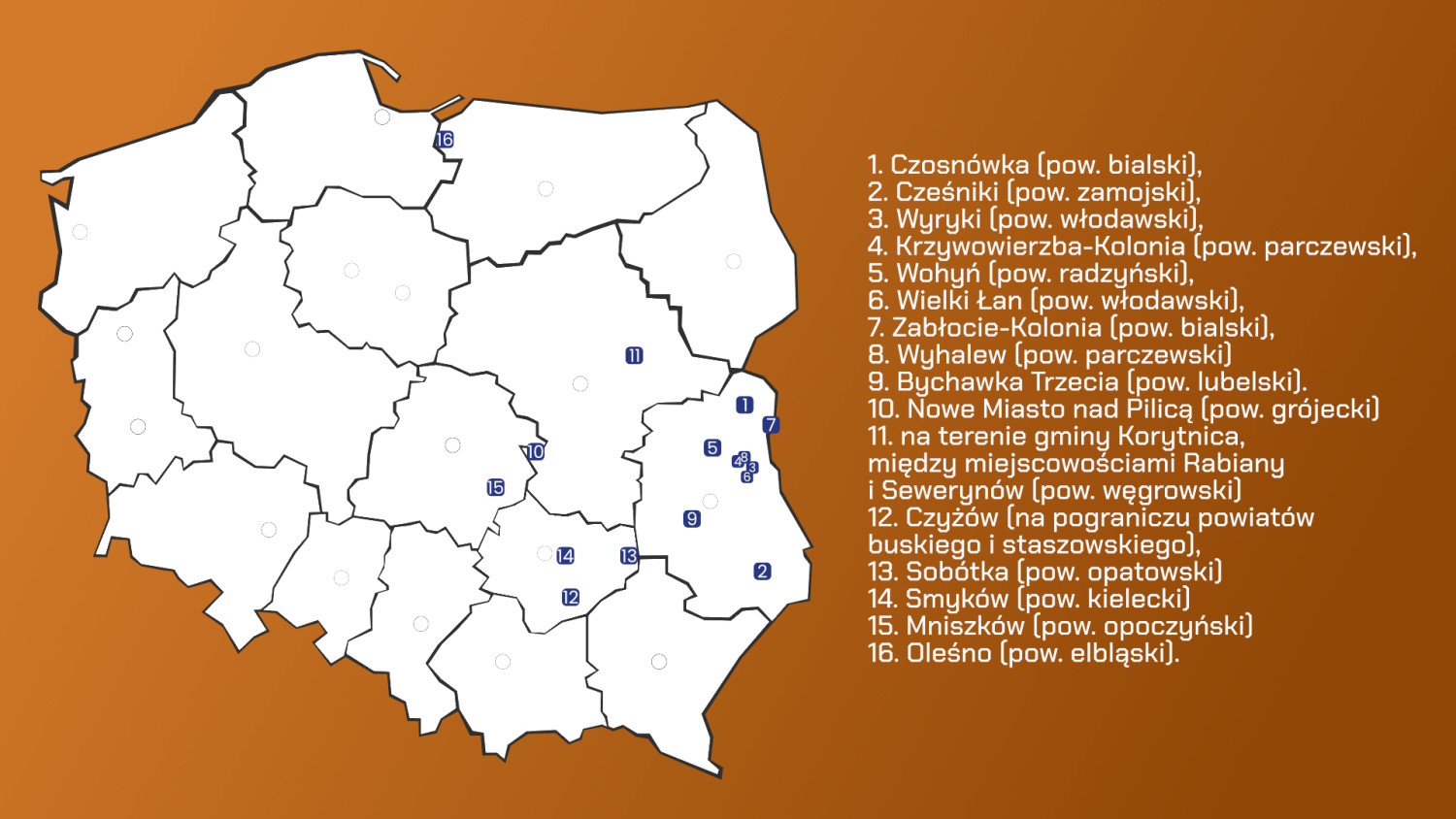 W województwie świętokrzyskim zaś w Czyżowie (na pograniczu powiatów buskiego i staszowskiego), Sobótce (pow. opatowski) i Smykowie (pow. kielecki), w województwie łódzkim w Mniszkowie (pow. opoczyński), a w województwie warmińsko-mazurskim – w miejscowości Oleśno (pow. elbląski) z kolei w województwie lubelskim w miejscowościach Czosnówka (pow. bialski), Cześniki (pow. zamojski), Wyryki (pow. włodawski), Krzywowierzba-Kolonia (pow. parczewski), Wohyń (pow. radzyński), Wielki Łan (pow. włodawski), Zabłocie-Kolonia (pow. bialski), Wyhalew (pow. parczewski) i Bychawka Trzecia (pow. lubelski).