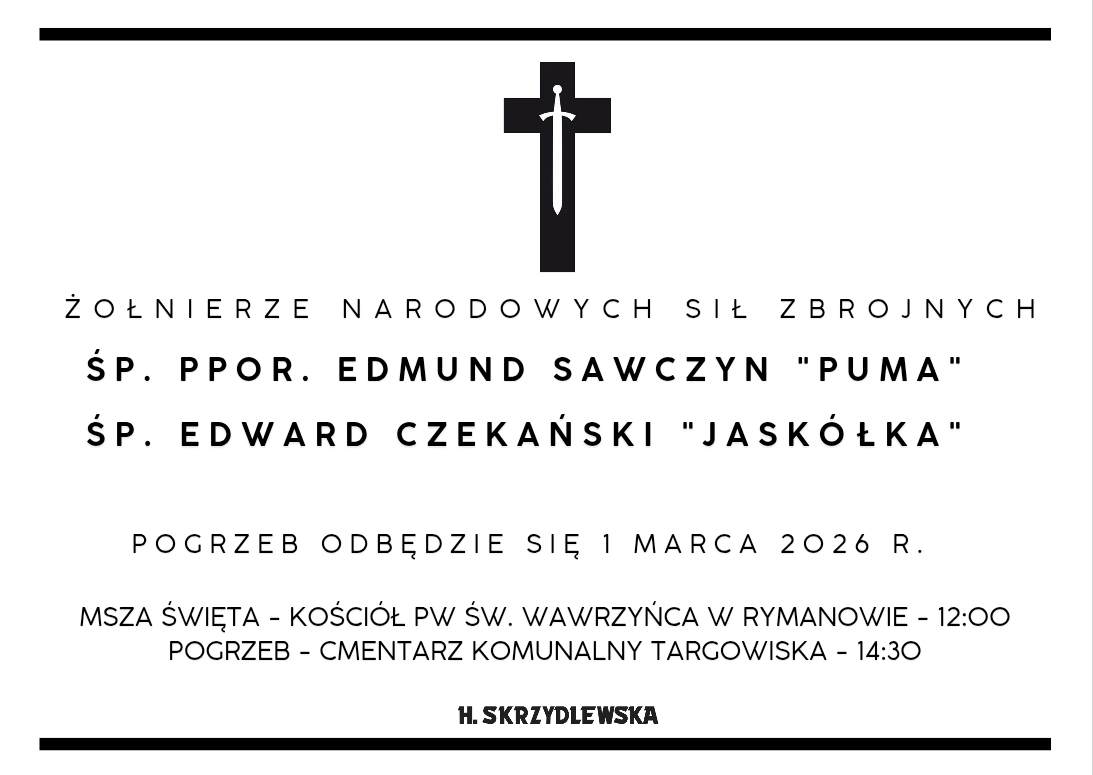 W niedzielę, 1 marca 2026 roku, odbędą się uroczystości pogrzebowe żołnierzy Narodowych Sił Zbrojnych: śp. ppor. Edmunda Sawczyna ps. „Puma” oraz śp. Edwarda Czekańskiego ps. „Jaskółka”. Wydarzenie będzie miało charakter patriotyczny i zgromadzi przedstawicieli środowisk kombatanckich, historycznych oraz mieszkańców regionu.