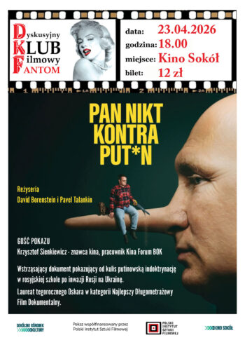 Dyskusyjny Klub Filmowy „Fantom” zaprasza do kina „Sokół” na pokaz filmu pt. „Pan Nikt kontra Putin”, który odbędzie się 23 kwietnia 2026 roku (czwartek) o godz. 18:00. Bilety w cenie 12 zł. Gościem pokazu będzie Krzysztof Sienkiewicz – znawca kina, pracownik Kina Forum BOK.