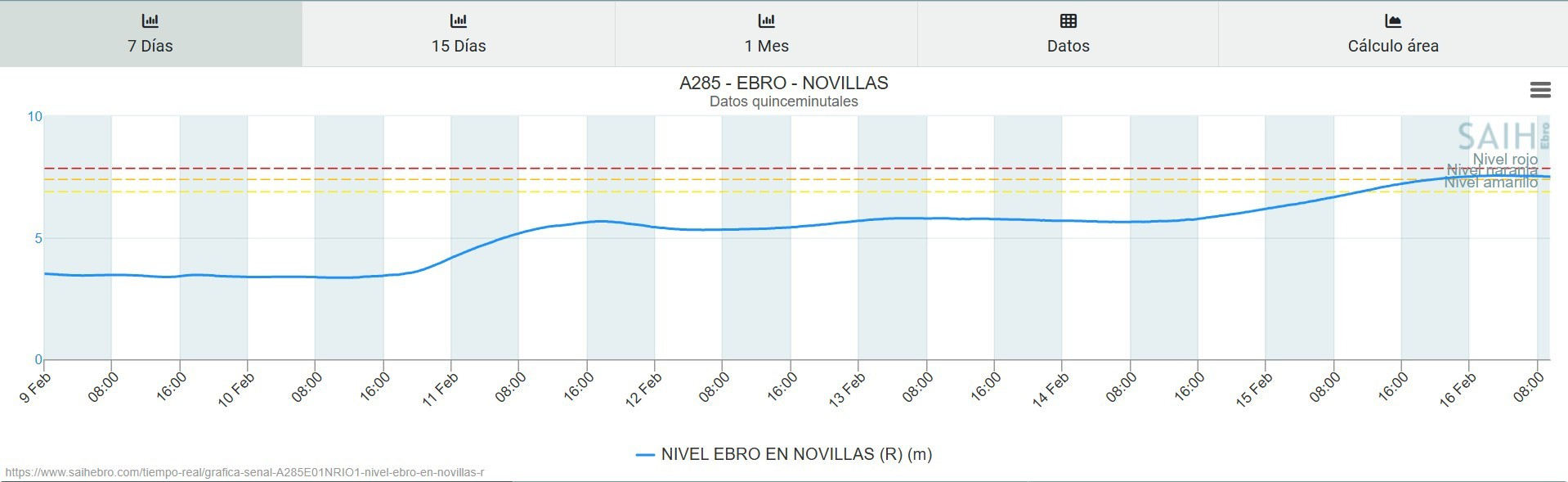 La estación de Novillas registra un nivel naranja con 7,51 metros a las 9:30 horas. Aguas abajo de Gallur, el río alcanza 7,66 metros a la misma hora, con un caudal de 1.495 metros cúbicos por segundo medido a las 3:00 horas.